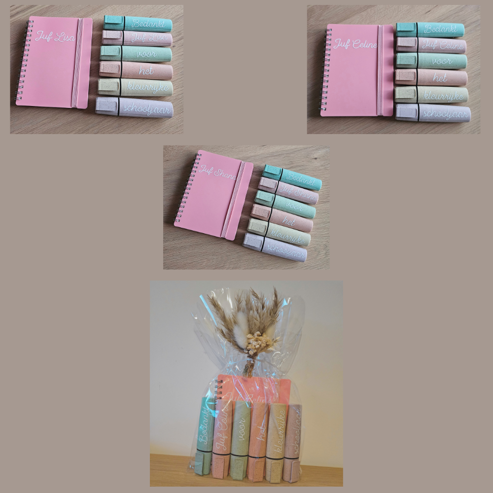 Setje van 6 fluostiften + schriftje - met naam